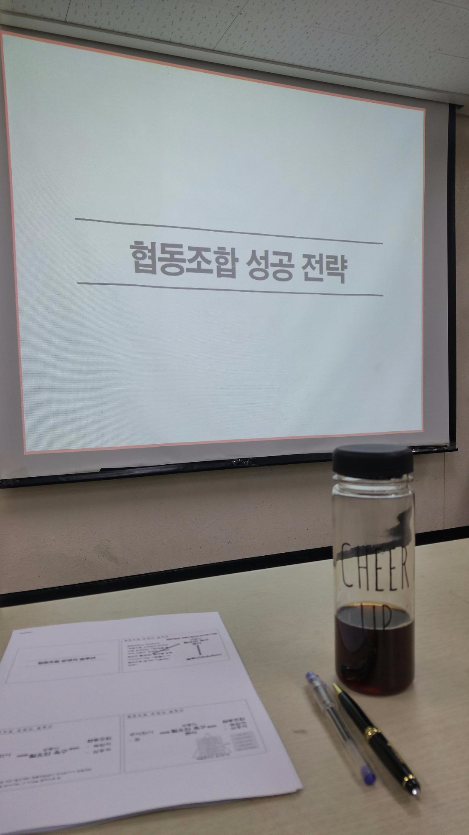 수업을 마치자마자 곧바로 버스를 타고 집에 와서 바로 밥을 먹고 동부여성센터로 갔다. 이때 문자가 왔는데, 택배가 온다고 했는데 먼지 몰랐다. 일단 집 앞에 두고 가라고 문자 보내고 수업 ㄱㄱ 오늘은 협동조합에 대한 마지막 수업이었는데 관심 있는 분야끼리 조를 나눠서 세세하게 회의를 거쳐서 진짜 협동조합을 만들게 된다면 오늘 강의하신 분이 지원을 해줄 수 있다는 긍정적 답변을 해주셨다. 이런저런 이야기들이 오가고… 우리 조는 나와 맞는 콘텐츠는 한분뿐이라 협동조합을 만들 수는 없었다. 협동조합은 5명 이상 모여야 한다.
