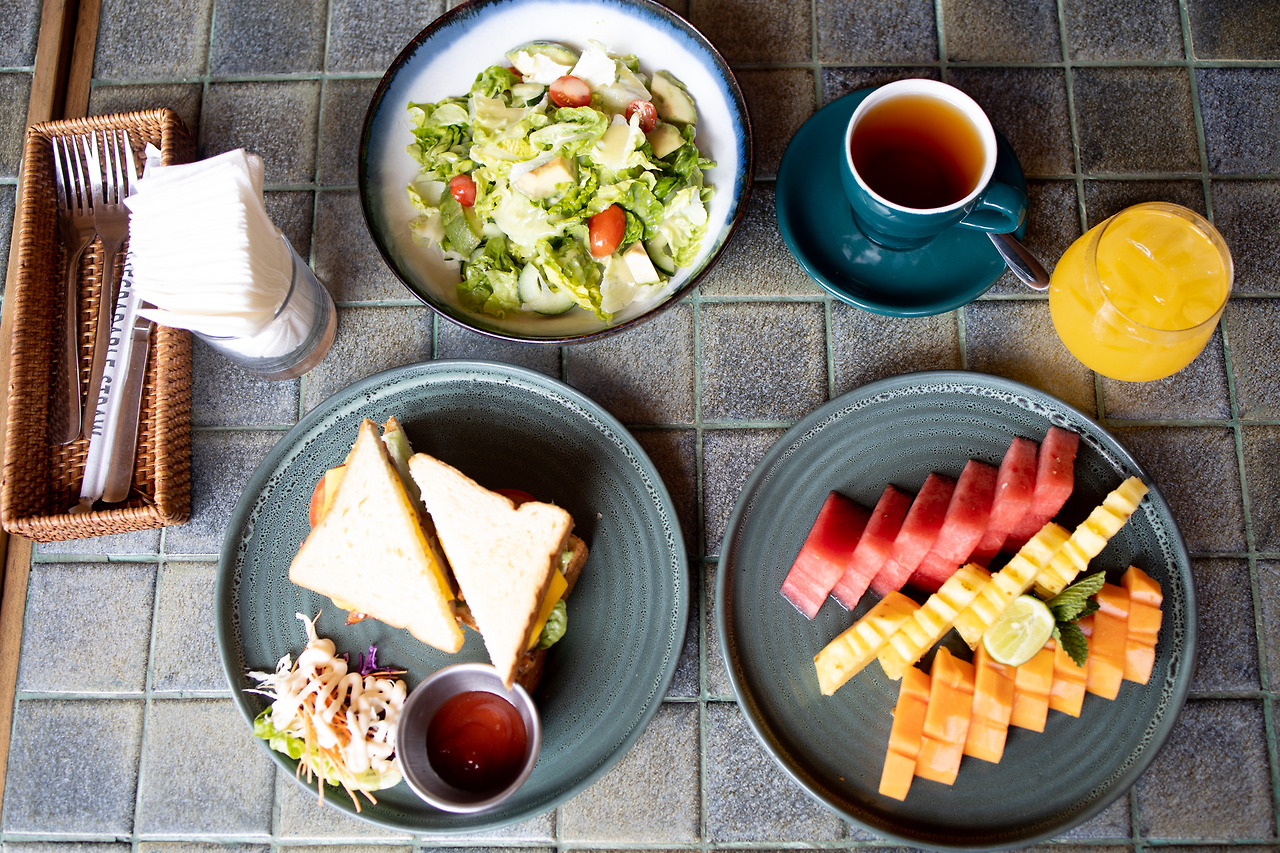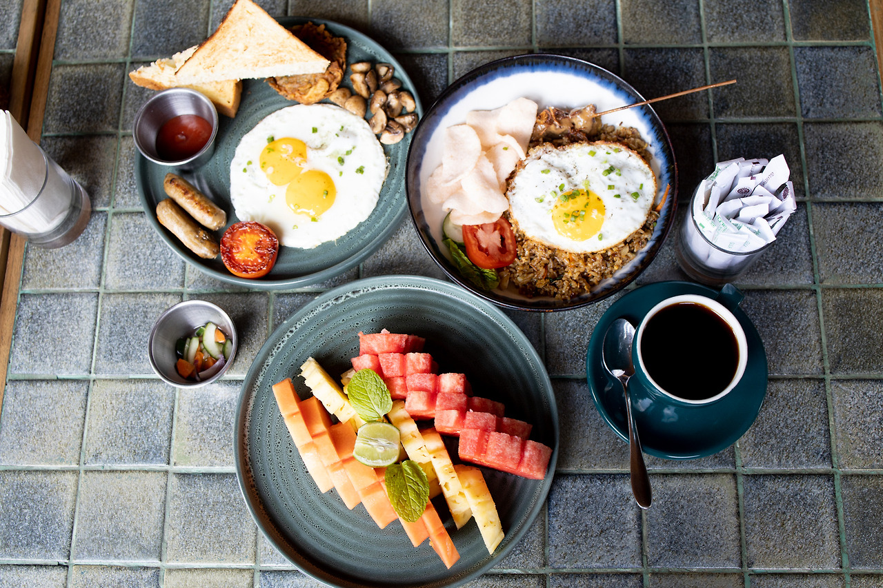 조식은 Hutan Day Club에서 총 4개 메뉴 중에 택 1 해서 먹을 수 있었고, 음료는 커피, 티, 오렌지 주스 중에 한 가지를 고를 수 있었다. 조식메뉴는 5가지 다 맛보았는데, 모두 다 훌륭했다! 웨스턴 메뉴를 좋아한다면 치킨 샌드위치 추천한다. (치킨이 생각보다 부드럽고 맛이 좋았다.) 그리고 현지식을 원한다면 나시고랭 강추! 너무너무 맛있어서 첫째날, 둘째날 모두 포장해서 점심때 먹었다. 그릭샐러드와 과일도 훌륭했다. 아메리칸 블랙퍼스트는 첫째날 먹었는데 기본에 충실했다. 커피랑 잘 어울리는 메뉴!